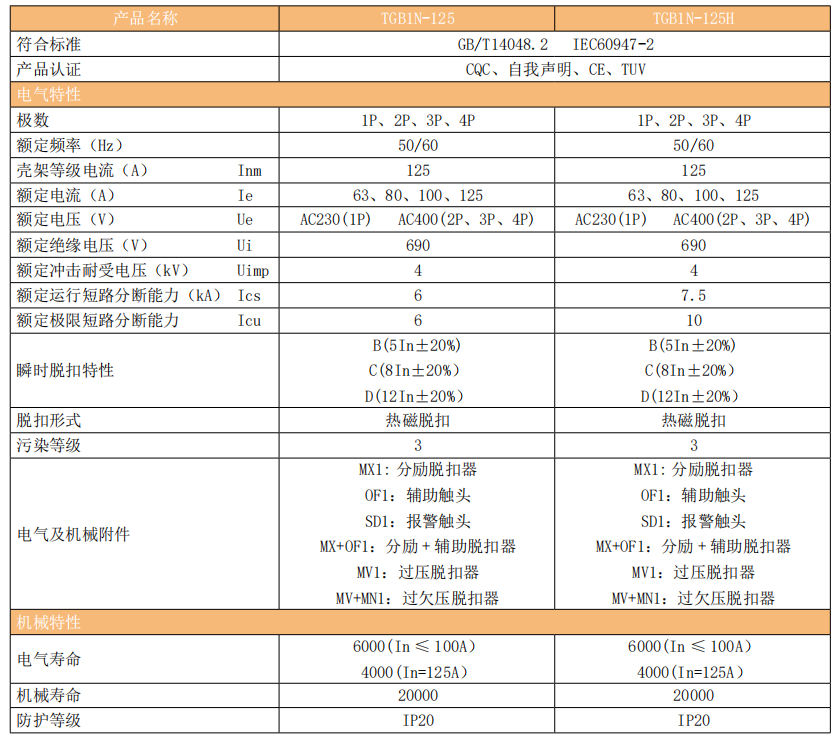 TGB1N-125(H) 塑料外壳式断路器(以下简称断路器)主要适用于交流 50/60Hz,额定工作电压 230V/400V,额定电流至 125A 及以下的线路中,起过载、短路、隔离保护,也可在正常情况下不频繁通断电气装置和照明线路。