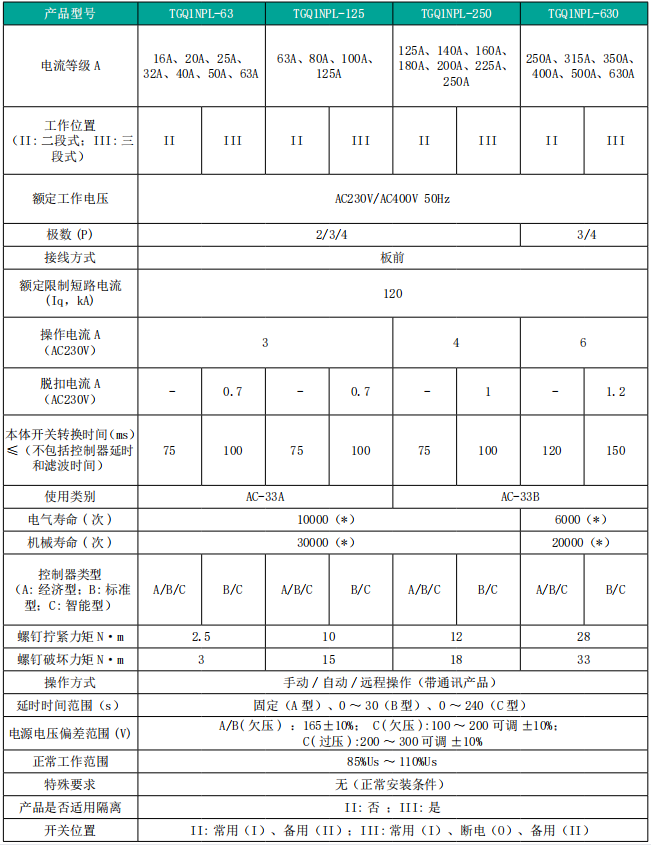TGQ1NPL 系列自动转换开关适用于交流 50Hz,额定工作电压 AC230V/AC400V, 额定电流至630A 的单相二线 / 三相四线双路供电电网中,用于从一路电源断开负载电路并连接至另一路电源上。具有自行动作和可选的人工操作特性的转换开关电器。当常用电源被检测到出现异常时,ATSE 自动将负载从常用电源转换至备用电源如果常用电源恢复正常时,在自投自复模式下,则自动将负载返回至常用电源。